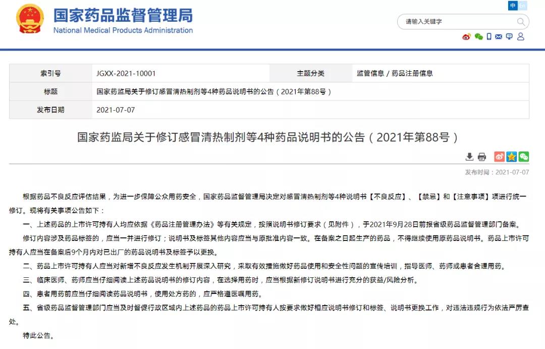 國(guó)家藥監(jiān)局關(guān)于修訂感冒清熱制劑等4種藥品說(shuō)明書(shū)的公告(2021年第88號(hào)) (2021-07-07)