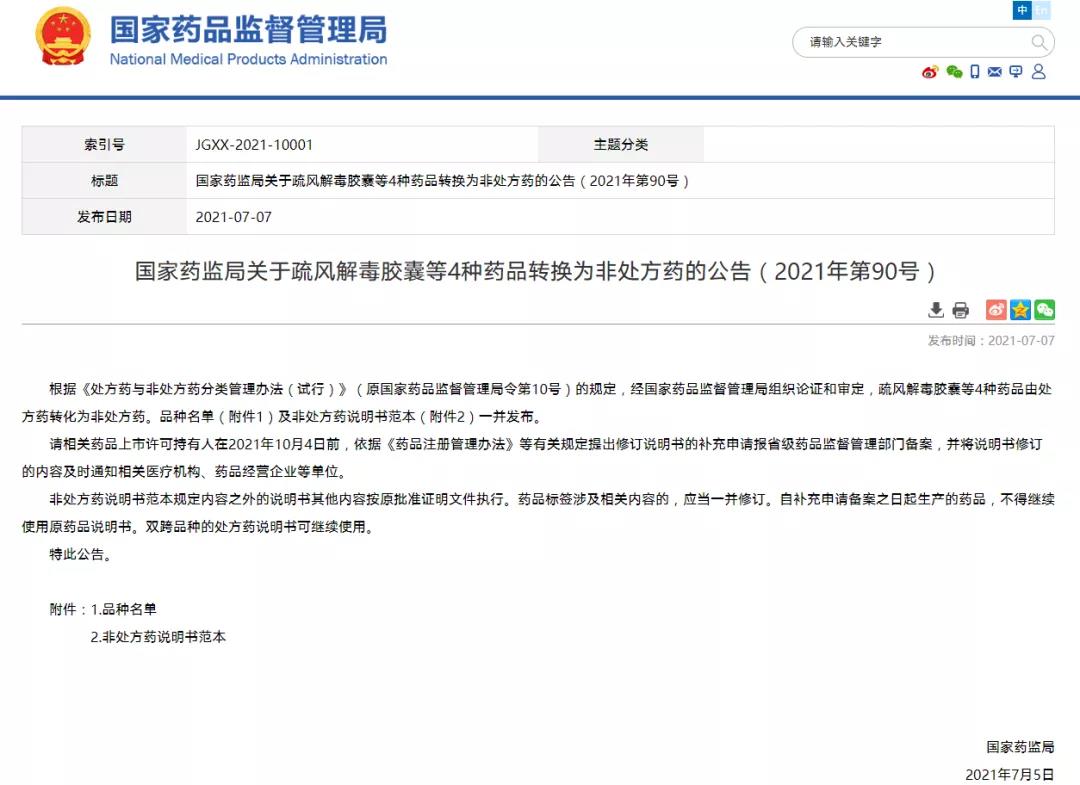 國(guó)家藥監(jiān)局關(guān)于疏風(fēng)解毒膠囊等4種藥品轉(zhuǎn)換為非處方藥的公告(2021年第90號(hào)) (2021-07-07)