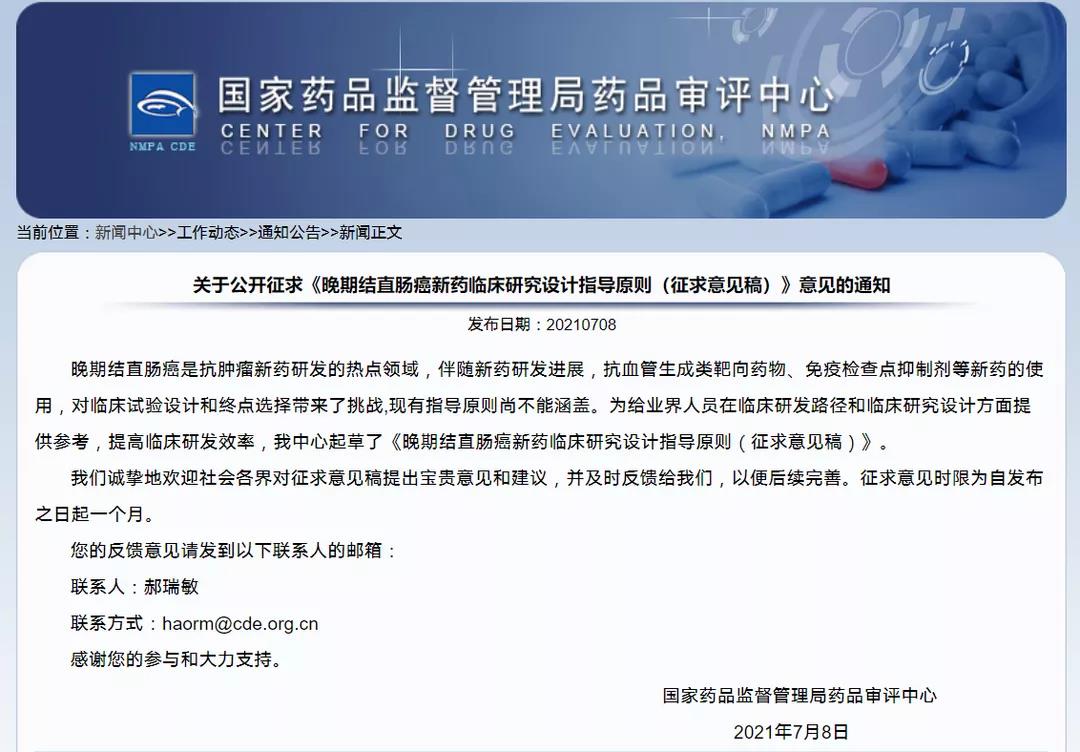 關(guān)于公開(kāi)征求《晚期結(jié)直腸癌新藥臨床研究設(shè)計(jì)指導(dǎo)原則(征求意見(jiàn)稿)》意見(jiàn)的通知