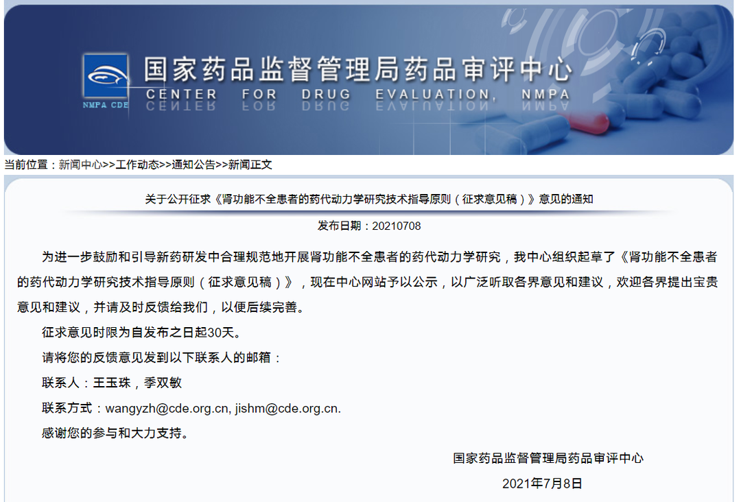關(guān)于公開(kāi)征求《腎功能不全患者的藥代動(dòng)力學(xué)研究技術(shù)指導(dǎo)原則(征求意見(jiàn)稿)》意見(jiàn)的通知