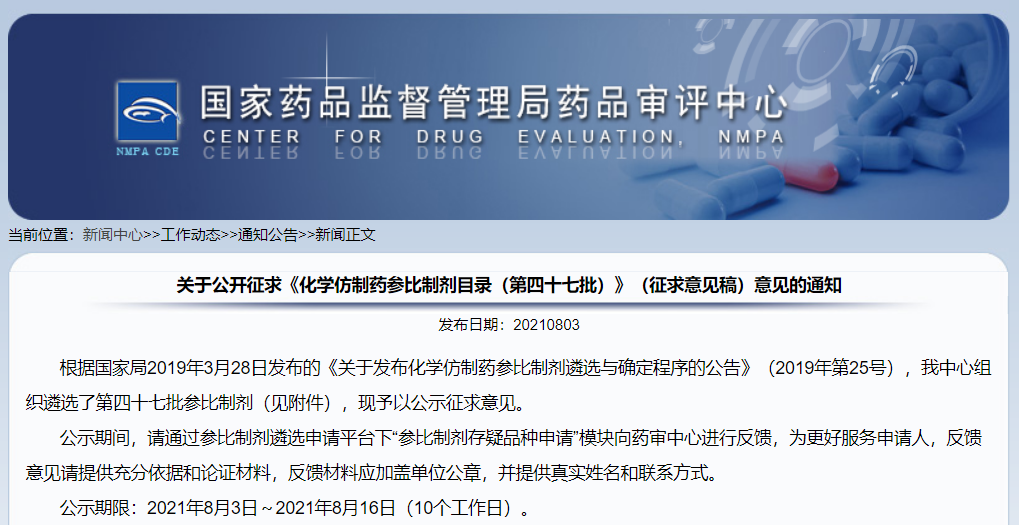 關于公開征求《化學仿制藥參比制劑目錄(第四十七批)》(征求意見稿)意見的通知