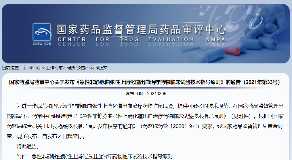 關于發布《急性非靜脈曲張性上消化道出血治療藥物臨床試驗技術指導原則》的通告(2021年第33號)