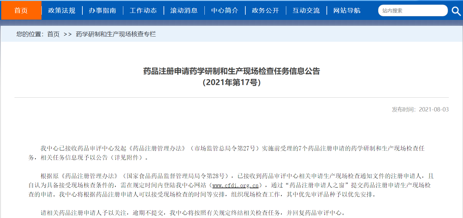 藥品注冊申請藥學研制和生產現場檢查任務信息公告(2021年第17號)