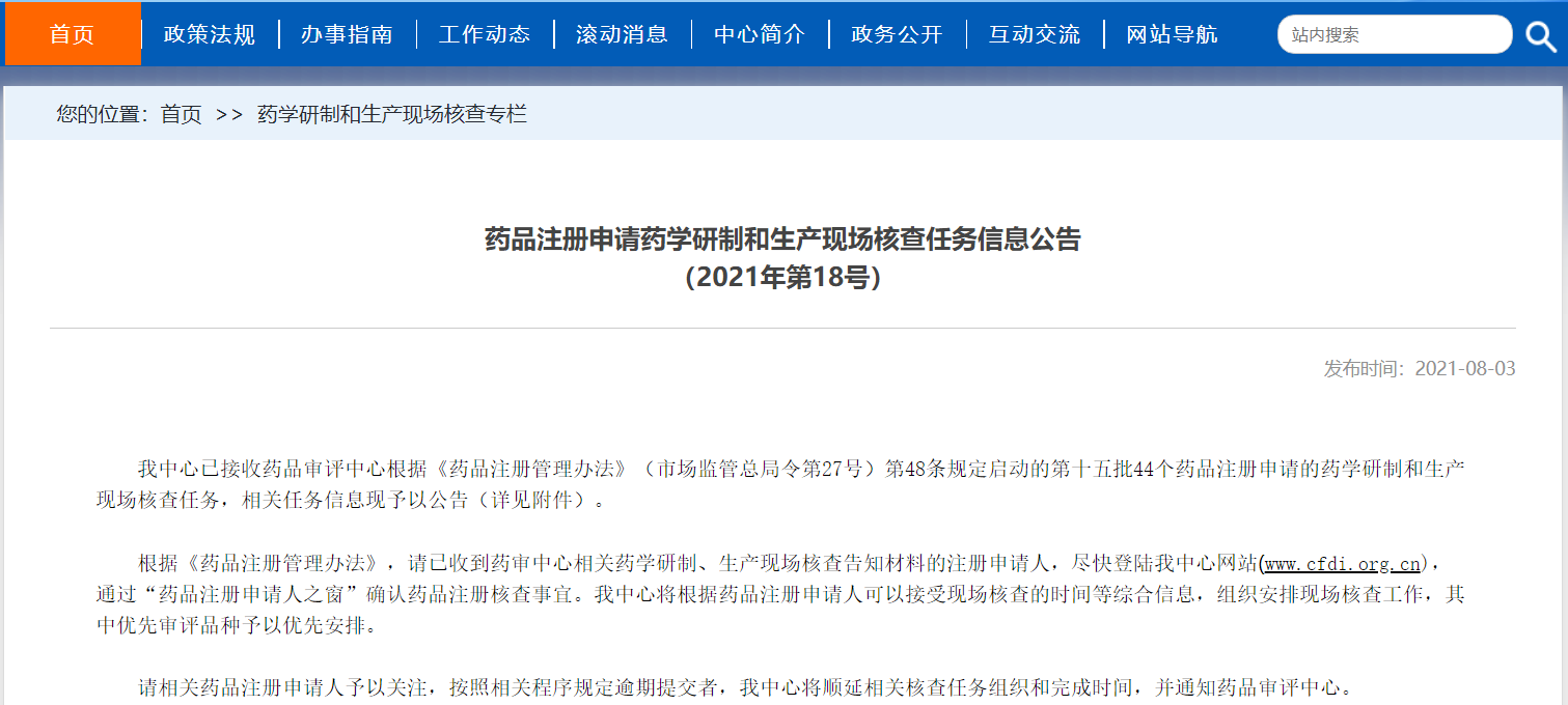藥品注冊申請藥學研制和生產現場核查任務信息公告(2021年第18號)
