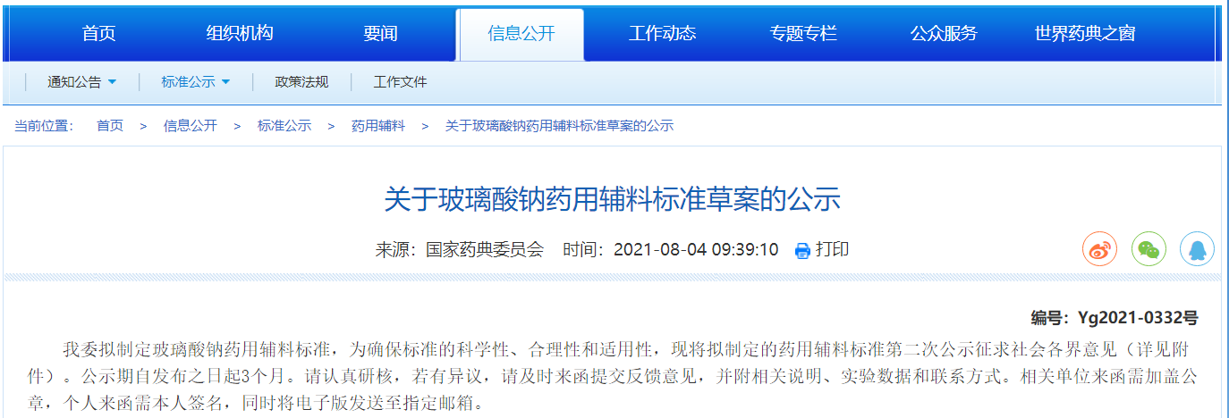 關于玻璃酸鈉藥用輔料標準草案的公示