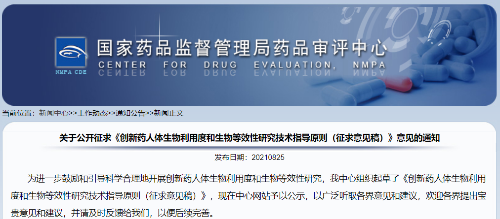 關(guān)于公開征求《創(chuàng)新藥人體生物利用度和生物等效性研究技術(shù)指導(dǎo)原則(征求意見稿)》意見的通知