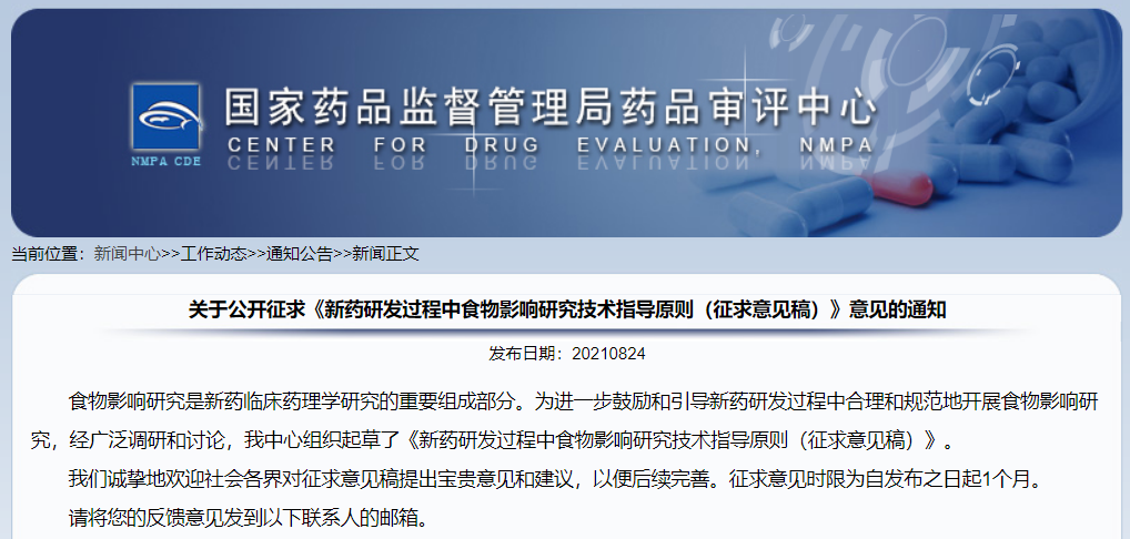 關(guān)于公開征求《新藥研發(fā)過程中食物影響研究技術(shù)指導(dǎo)原則(征求意見稿)》意見的通知