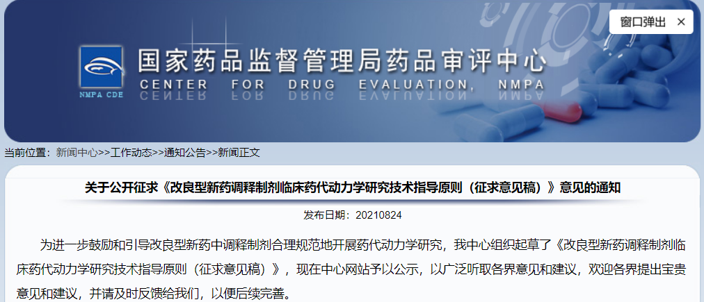關(guān)于公開征求《改良型新藥調(diào)釋制劑臨床藥代動力學研究技術(shù)指導(dǎo)原則(征求意見稿)》意見的通知