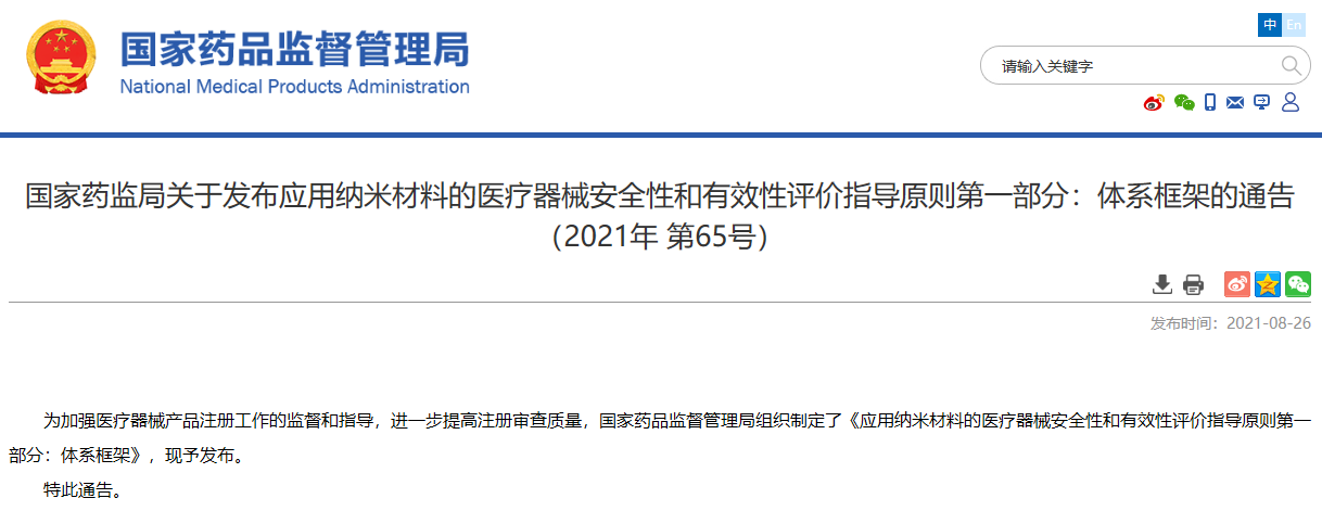 關(guān)于發(fā)布應(yīng)用納米材料的醫(yī)療器械安全性和有效性評價指導(dǎo)原則第一部分:體系框架的通告(2021年 第65號)