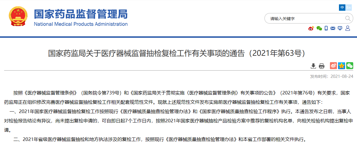 關(guān)于醫(yī)療器械監(jiān)督抽檢復(fù)檢工作有關(guān)事項的通告(2021年第63號)