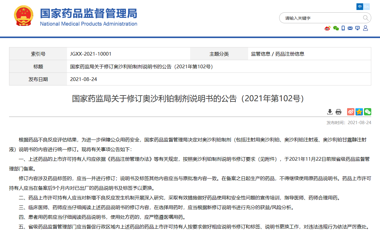 關(guān)于修訂奧沙利鉑制劑說明書的公告(2021年第102號)