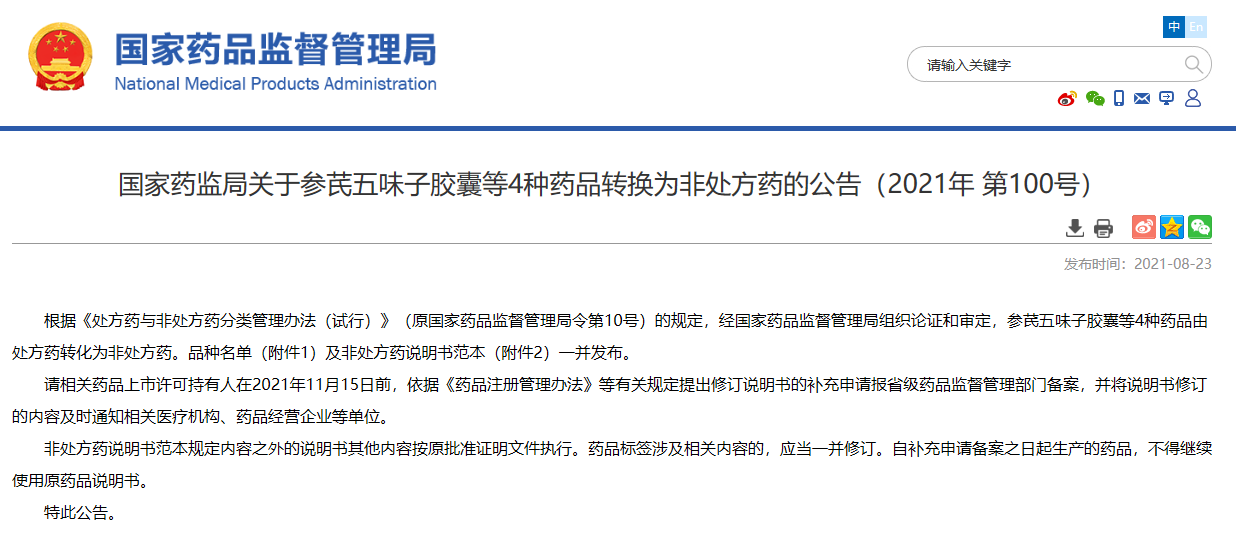 關(guān)于參芪五味子膠囊等4種藥品轉(zhuǎn)換為非處方藥的公告(2021年 第100號)