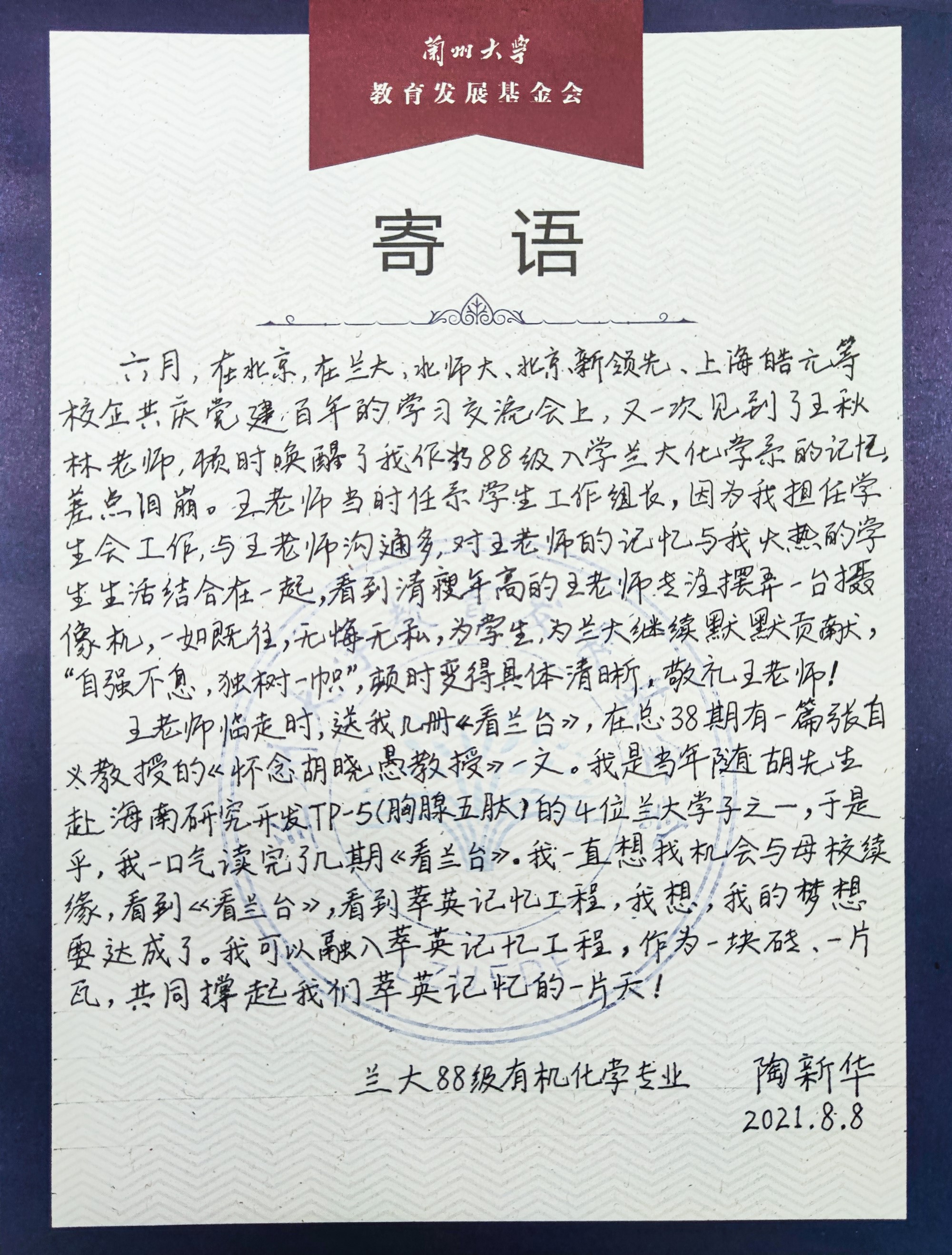 陶總談到,在蘭大求學的四年間,正是世界觀和人生觀重塑的階段,在母校“自強不息、獨樹一幟”的校風校訓的熏陶下,養成了獨立思考的人格和不屈的奮斗精神,在人生漫長的歲月中,無論身在何處、境遇如何,母校永遠是一個取之不盡用之不竭的力量源泉。追憶學校經歷,陶總還特別感謝了給予他人生指引和生活幫助的老師和同學們,讓他度過了令人懷念的大學時光。飲水思源,我們深切感謝母校的培育,也密切關注母校的建設和發展,呼吁更多的蘭大學子為母校貢獻綿薄之力!