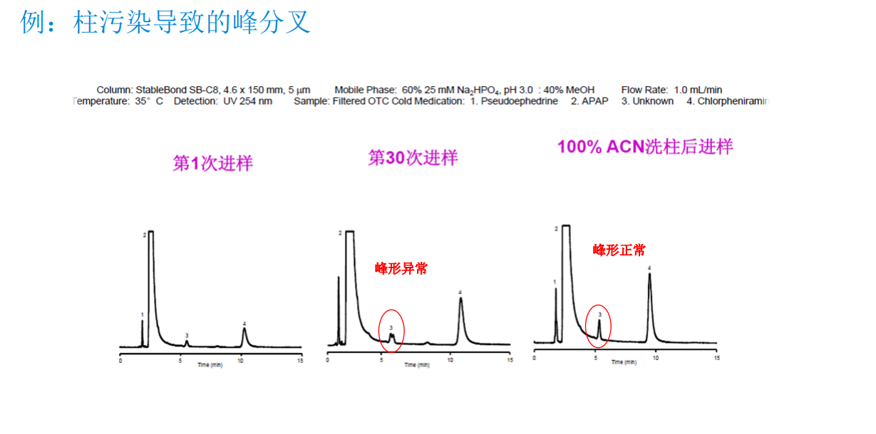 色譜柱在使用過程中因為樣品或者流動相帶來物理顆粒或者化學吸附,引起色譜柱的污染,這時會在色譜圖上有明顯的變化。出現色譜柱污染時,清洗或反沖清洗則需要根據色譜柱的特性進行操作。清洗或反沖清洗反相色譜柱時,用以下溶劑至少各30倍柱體積沖洗。
