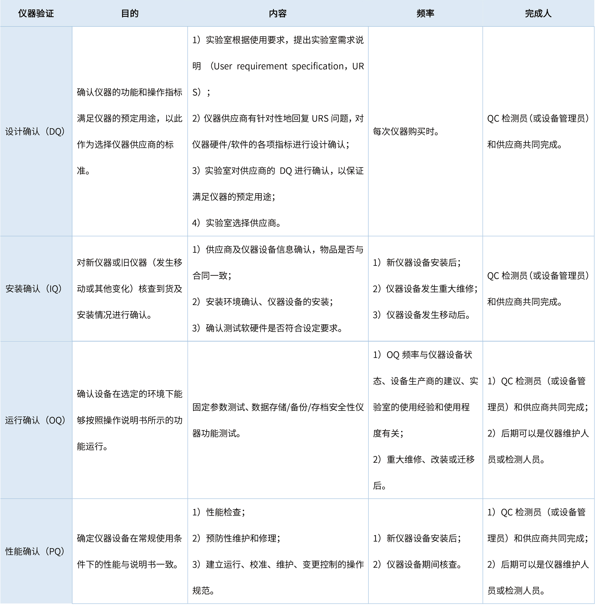 儀器運行之前的一系列工作可稱之為“儀確證”[2],由GMP規范和《檢測和校準實驗室能力認可準則》可知,“儀器確證”工作是檢測實驗室質量保證的重要途徑,需QC相關人員配合完成對應的實驗和文件。儀器確證是實驗室對儀器進行的生命周期全過程管理,通常用4Q確認的方式來體現,即DQ、IQ、OQ、PQ,具體內容見表2。