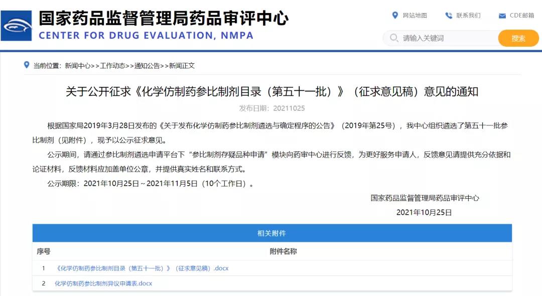 關(guān)于公開征求《化學(xué)仿制藥參比制劑目錄(第五十一批)》(征求意見稿)意見的通知