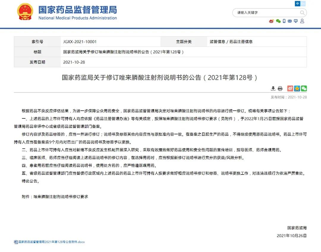 國家藥監(jiān)局關(guān)于修訂唑來膦酸注射劑說明書的公告(2021年第128號(hào))