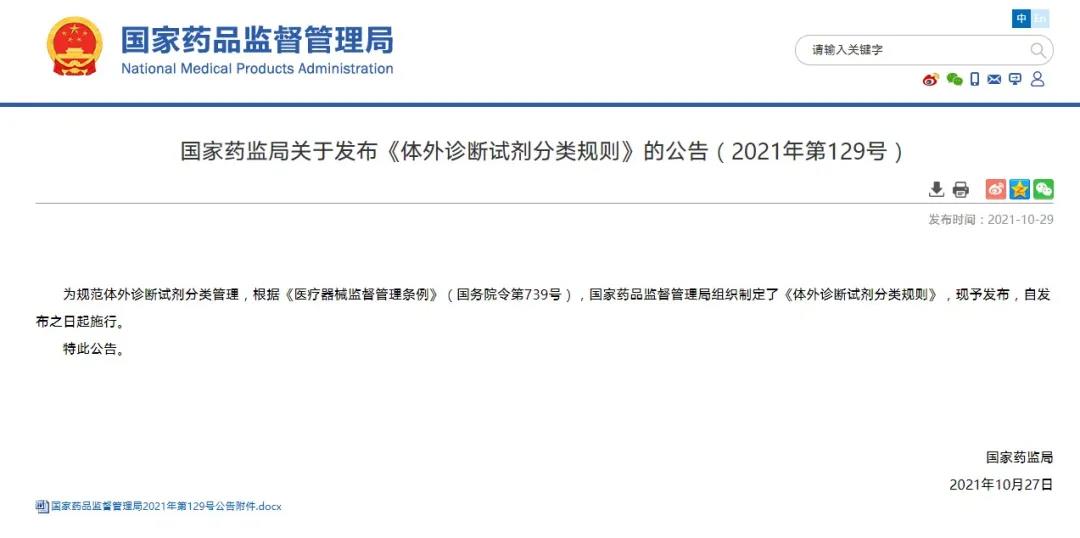 國家藥監(jiān)局關(guān)于發(fā)布《體外診斷試劑分類規(guī)則》的公告(2021年第129號(hào))