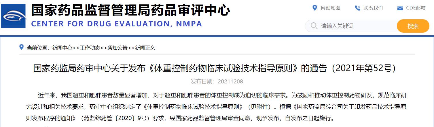 國家藥監局藥審中心關于發布《體重控制藥物臨床試驗技術指導原則》的通告(2021年第52號)
