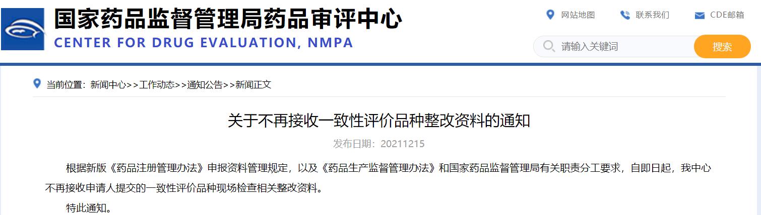 關于不再接收一致性評價品種整改資料的通知