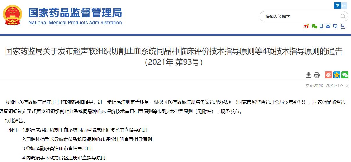國家藥監局關于發布超聲軟組織切割止血系統同品種臨床評價技術指導原則等4項技術指導原則的通告(2021年 第93號)