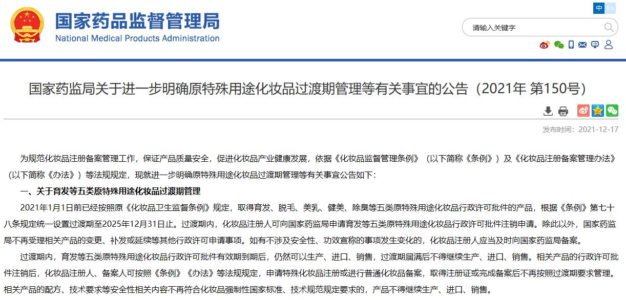 國家藥監局關于進一步明確原特殊用途化妝品過渡期管理等有關事宜的公告(2021年 第150號)