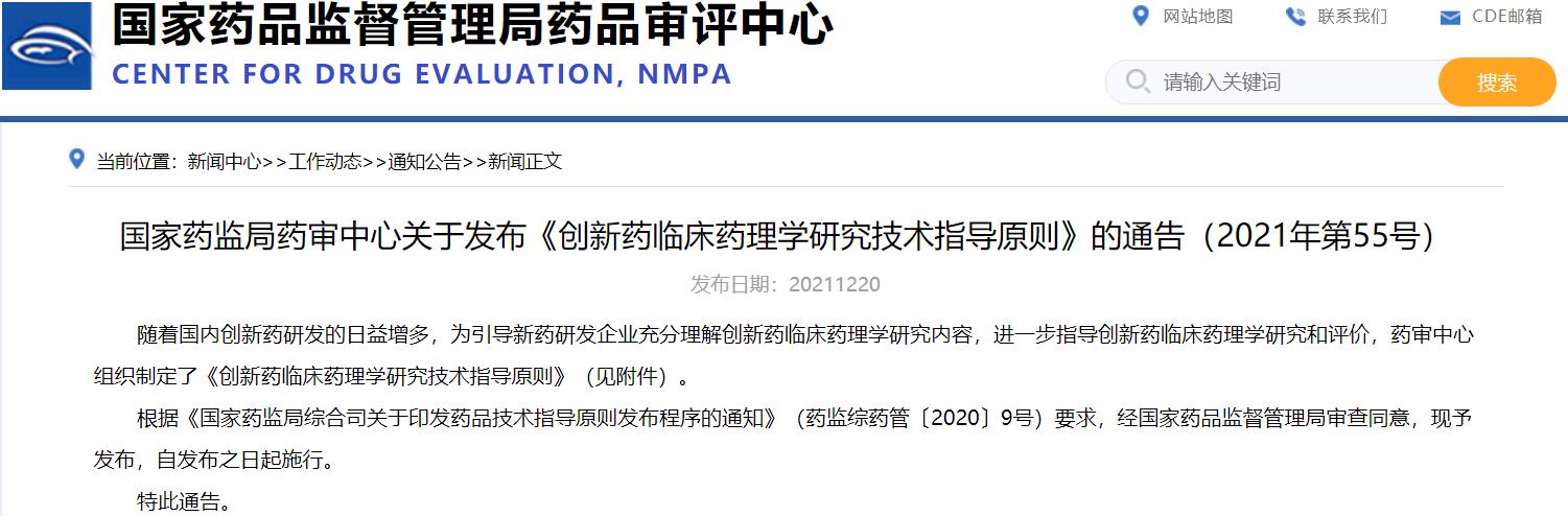 國家藥監局藥審中心關于發布《創新藥臨床藥理學研究技術指導原則》的通告(2021年第55號)