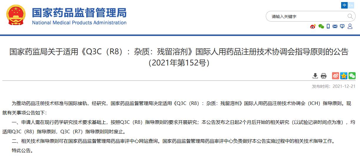 國家藥監局關于適用《Q3C(R8):雜質:殘留溶劑》國際人用藥品注冊技術協調會指導原則的公告(2021年第152號)