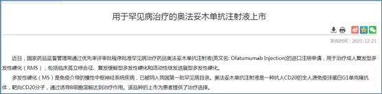 2021年,CDE發布兩則關于罕見病用藥的臨床研發指導原則,通過優先審評審批方式批準2款罕見病用藥,分別為奧法妥木單抗注射液(用于治療成人復發型多發性硬化(RMS)) 和注射用司妥昔單抗(用于人體免疫缺陷病毒(HIV)陰性和人皰疹病毒8型(HHV-8)陰性的多中心Castleman病(MCD)成人患者)。