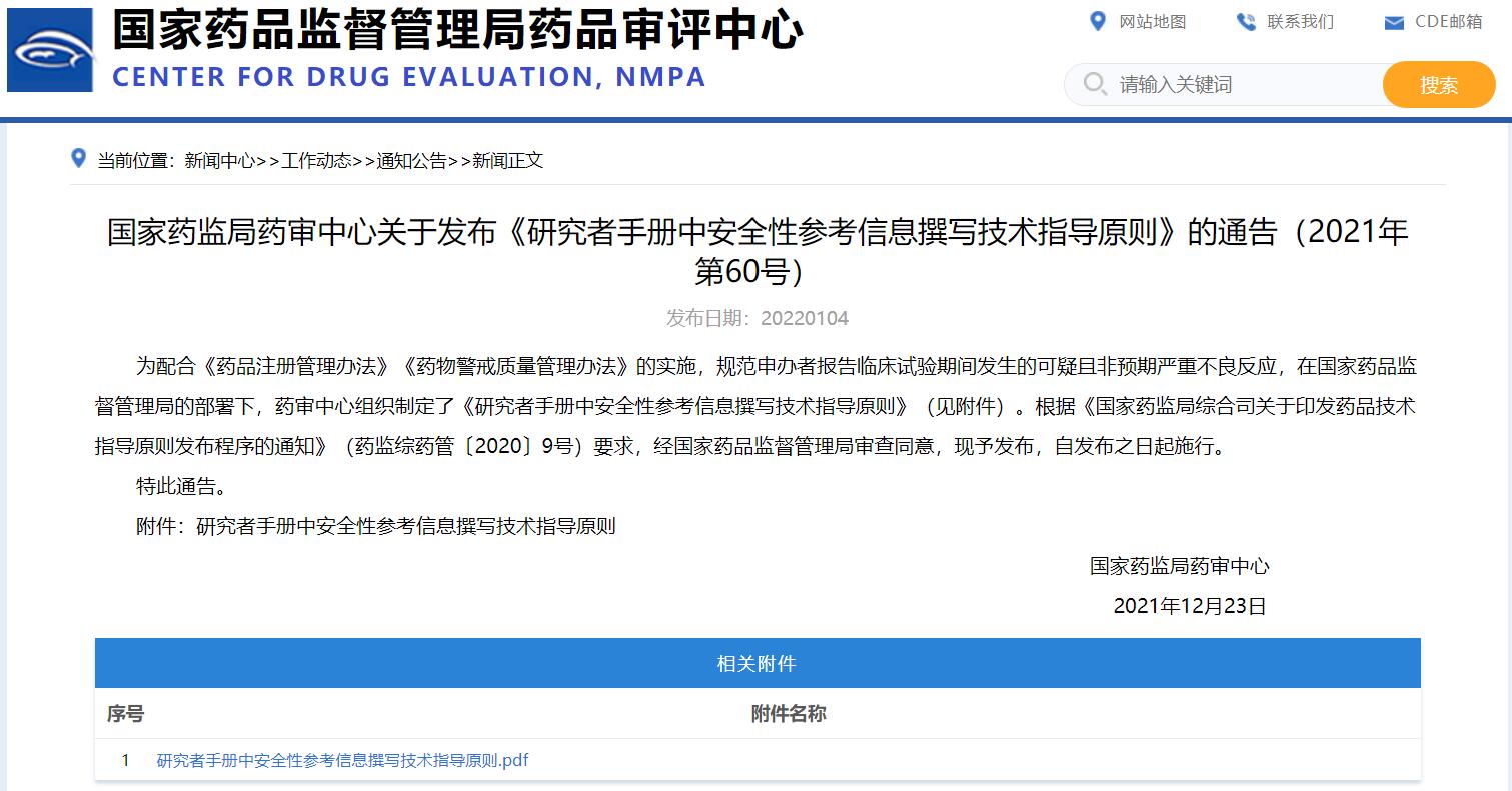 國家藥監(jiān)局藥審中心關(guān)于發(fā)布《研究者手冊(cè)中安全性參考信息撰寫技術(shù)指導(dǎo)原則》的通告(2021年第60號(hào))