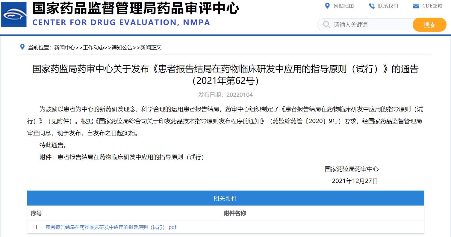 國家藥監(jiān)局藥審中心關(guān)于發(fā)布《患者報(bào)告結(jié)局在藥物臨床研發(fā)中應(yīng)用的指導(dǎo)原則(試行)》的通告(2021年第62號(hào))