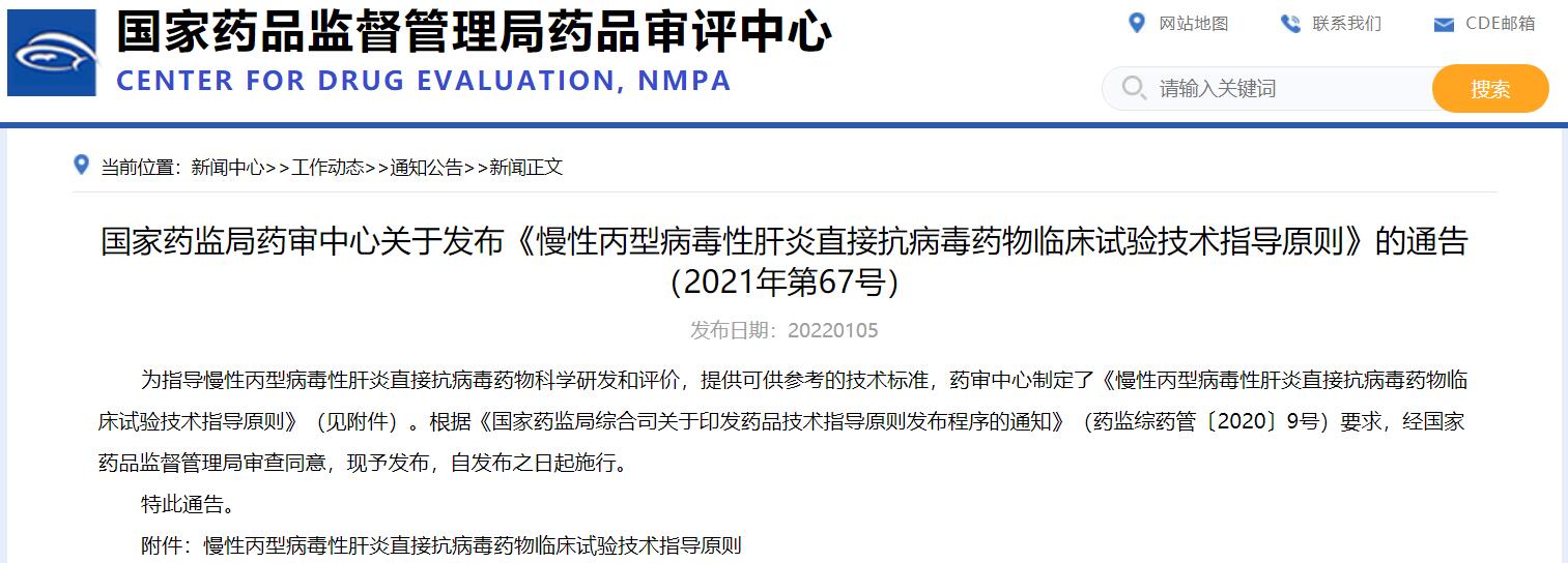 國家藥監(jiān)局藥審中心關(guān)于發(fā)布《慢性丙型病毒性肝炎直接抗病毒藥物臨床試驗(yàn)技術(shù)指導(dǎo)原則》的通告(2021年第67號(hào))