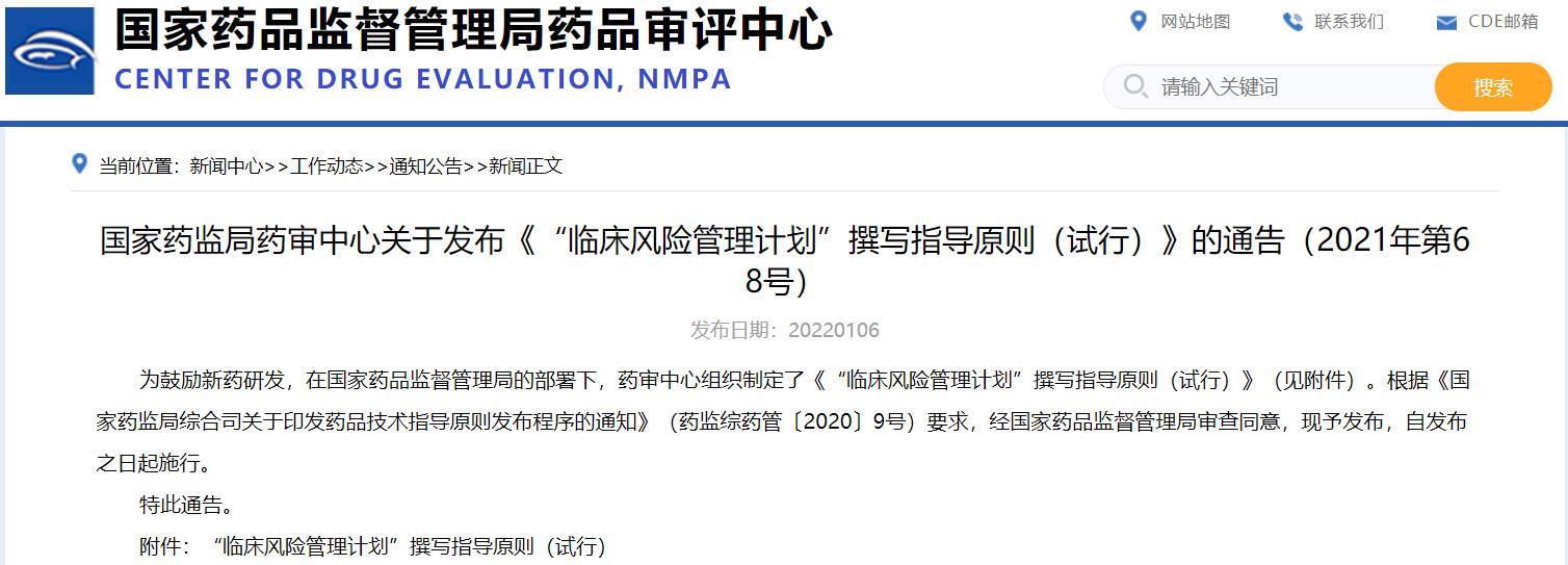 國家藥監(jiān)局藥審中心關(guān)于發(fā)布《“臨床風(fēng)險(xiǎn)管理計(jì)劃”撰寫指導(dǎo)原則(試行)》的通告(2021年第68號(hào))