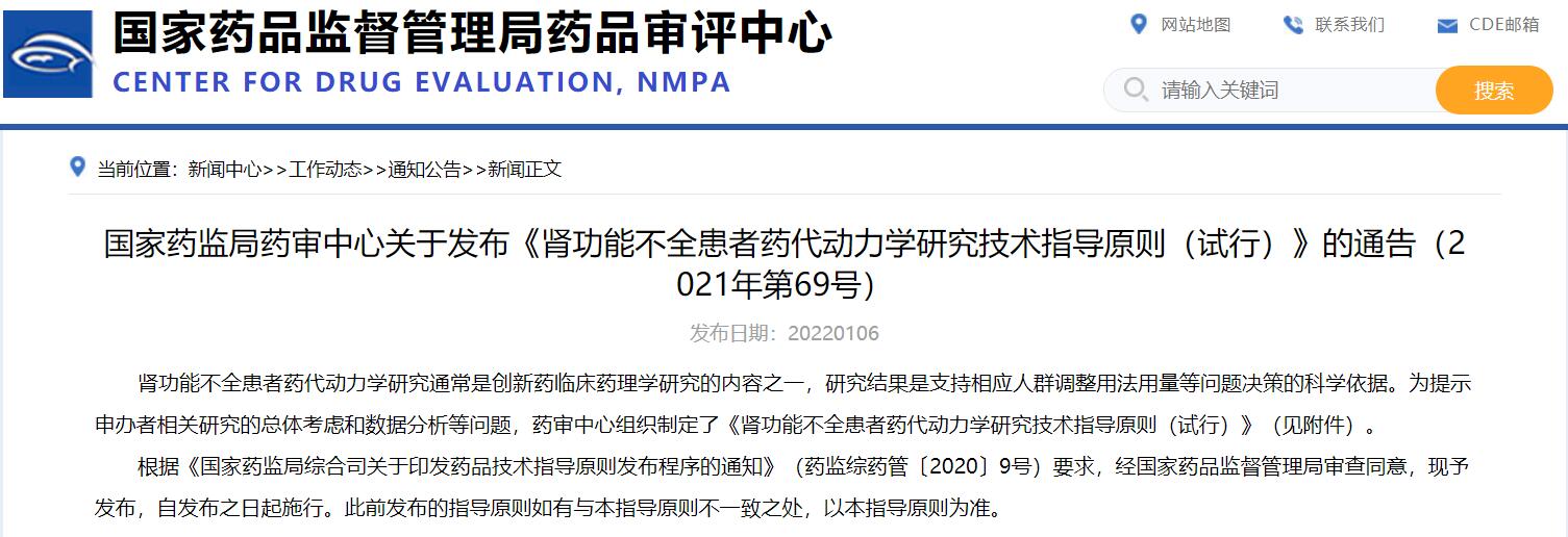 國家藥監(jiān)局藥審中心關(guān)于發(fā)布《腎功能不全患者藥代動(dòng)力學(xué)研究技術(shù)指導(dǎo)原則(試行)》的通告(2021年第69號(hào))