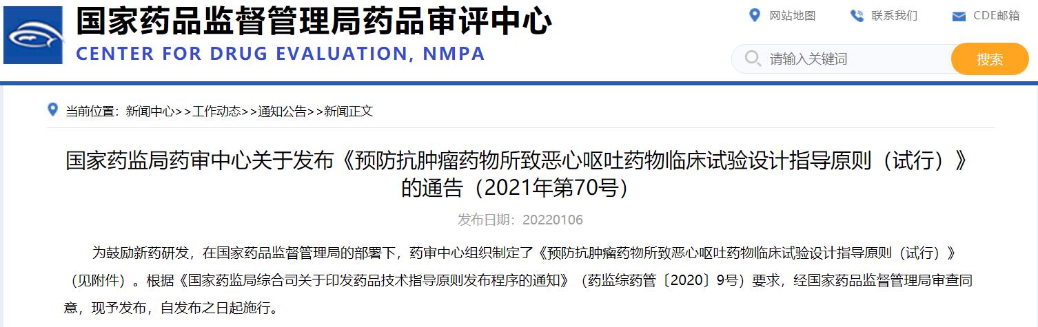 國家藥監(jiān)局藥審中心關(guān)于發(fā)布《預(yù)防抗腫瘤藥物所致惡心嘔吐藥物臨床試驗(yàn)設(shè)計(jì)指導(dǎo)原則(試行)》的通告(2021年第70號(hào))