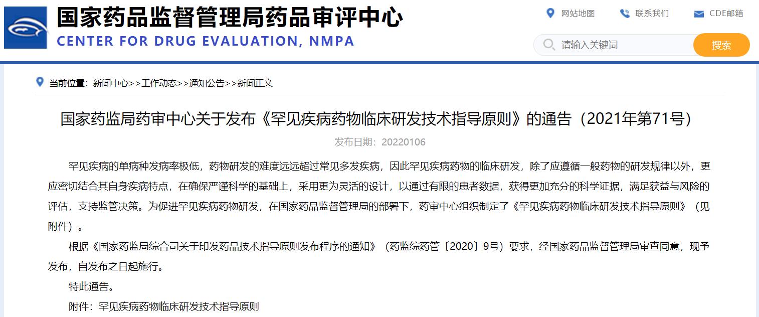 國家藥監(jiān)局藥審中心關(guān)于發(fā)布《罕見疾病藥物臨床研發(fā)技術(shù)指導(dǎo)原則》的通告(2021年第71號(hào))