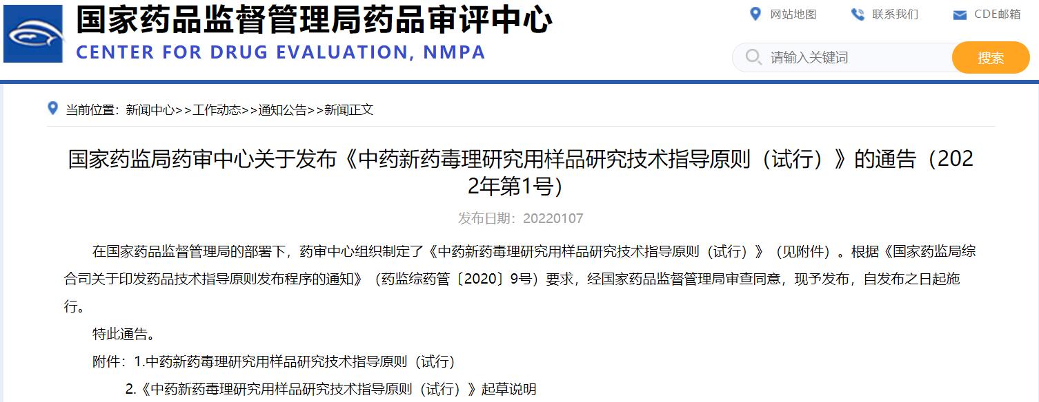 國家藥監(jiān)局藥審中心關(guān)于發(fā)布《中藥新藥毒理研究用樣品研究技術(shù)指導(dǎo)原則(試行)》的通告(2022年第1號(hào))