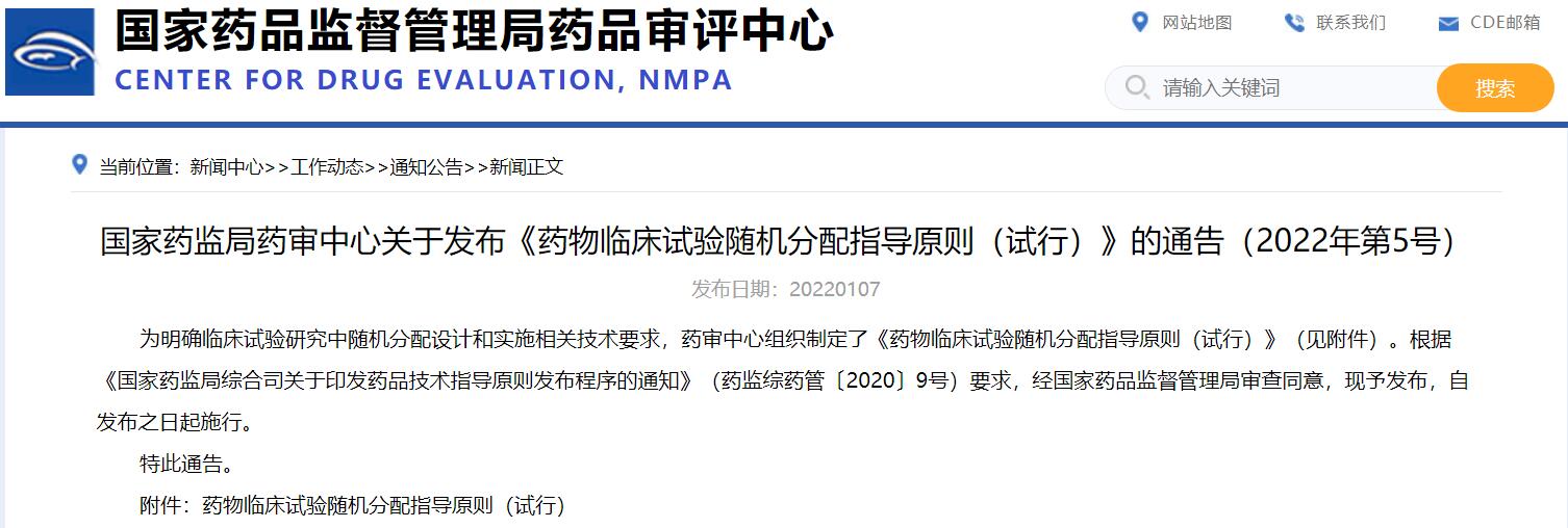 國家藥監(jiān)局藥審中心關(guān)于發(fā)布《藥物臨床試驗(yàn)隨機(jī)分配指導(dǎo)原則(試行)》的通告(2022年第5號(hào))