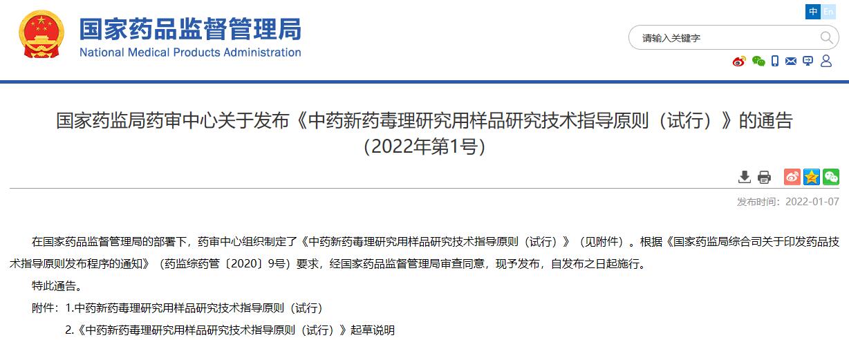 國家藥監(jiān)局藥審中心關(guān)于發(fā)布《中藥新藥毒理研究用樣品研究技術(shù)指導(dǎo)原則(試行)》的通告 (2022年第1號(hào))