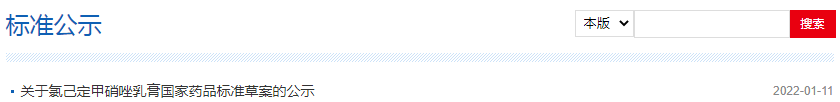 本周氯己定甲硝唑乳膏國家藥品標準草案的公示。