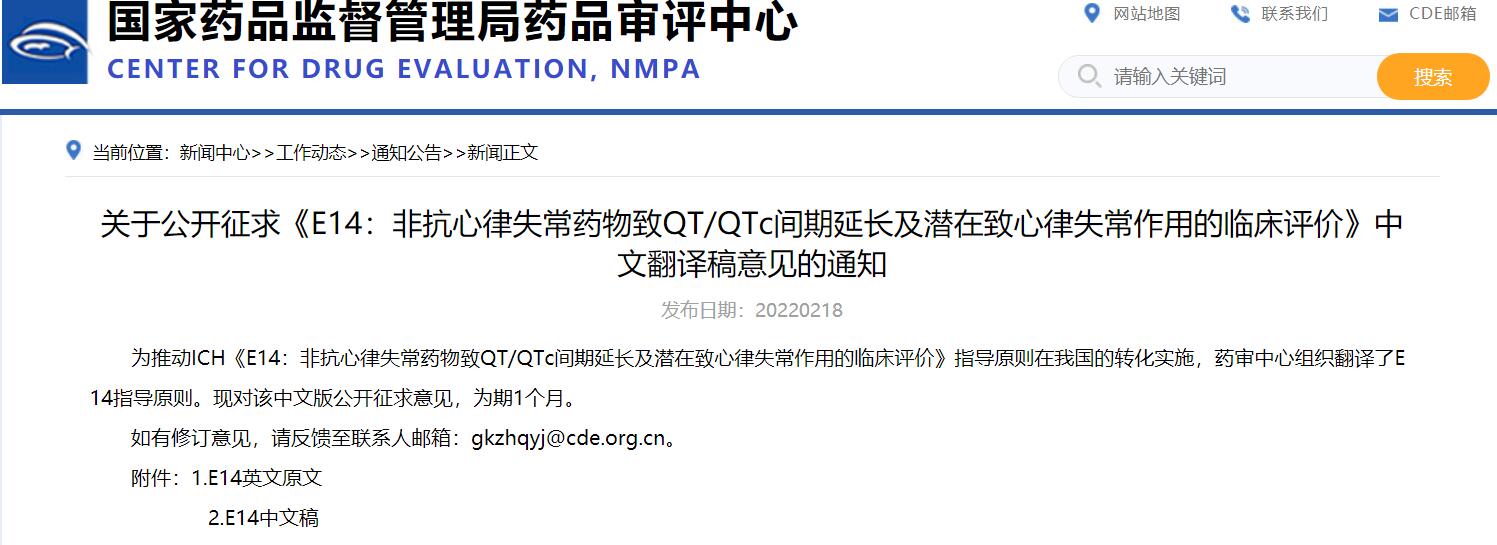 關(guān)于公開征求《E14:非抗心律失常藥物致QT/QTc間期延長及潛在致心律失常作用的臨床評價(jià)》中文翻譯稿意見的通知