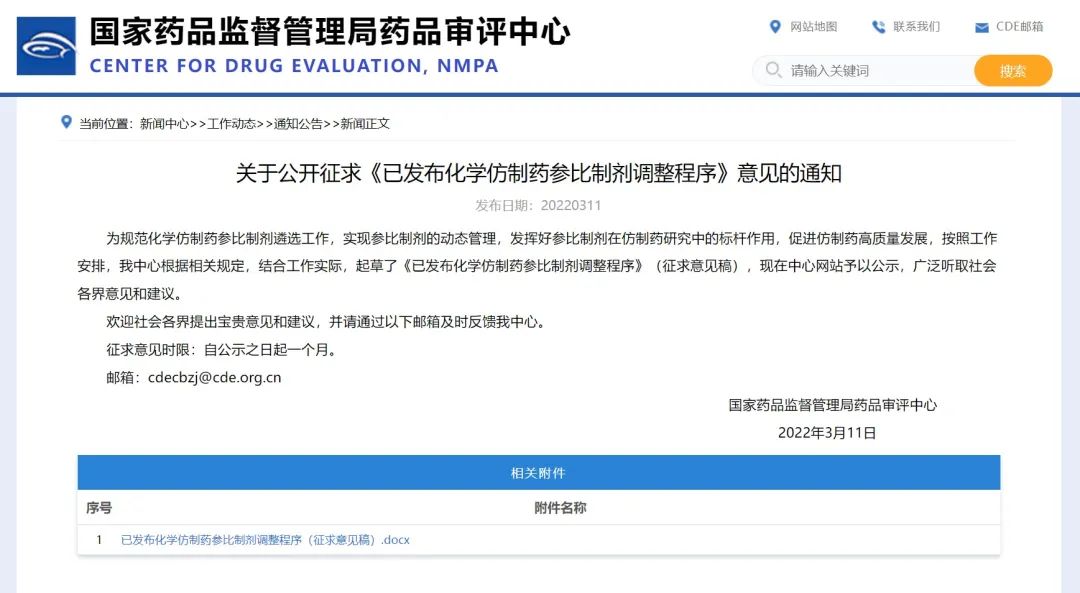 關(guān)于公開征求《已發(fā)布化學(xué)仿制藥參比制劑調(diào)整程序》意見的通知