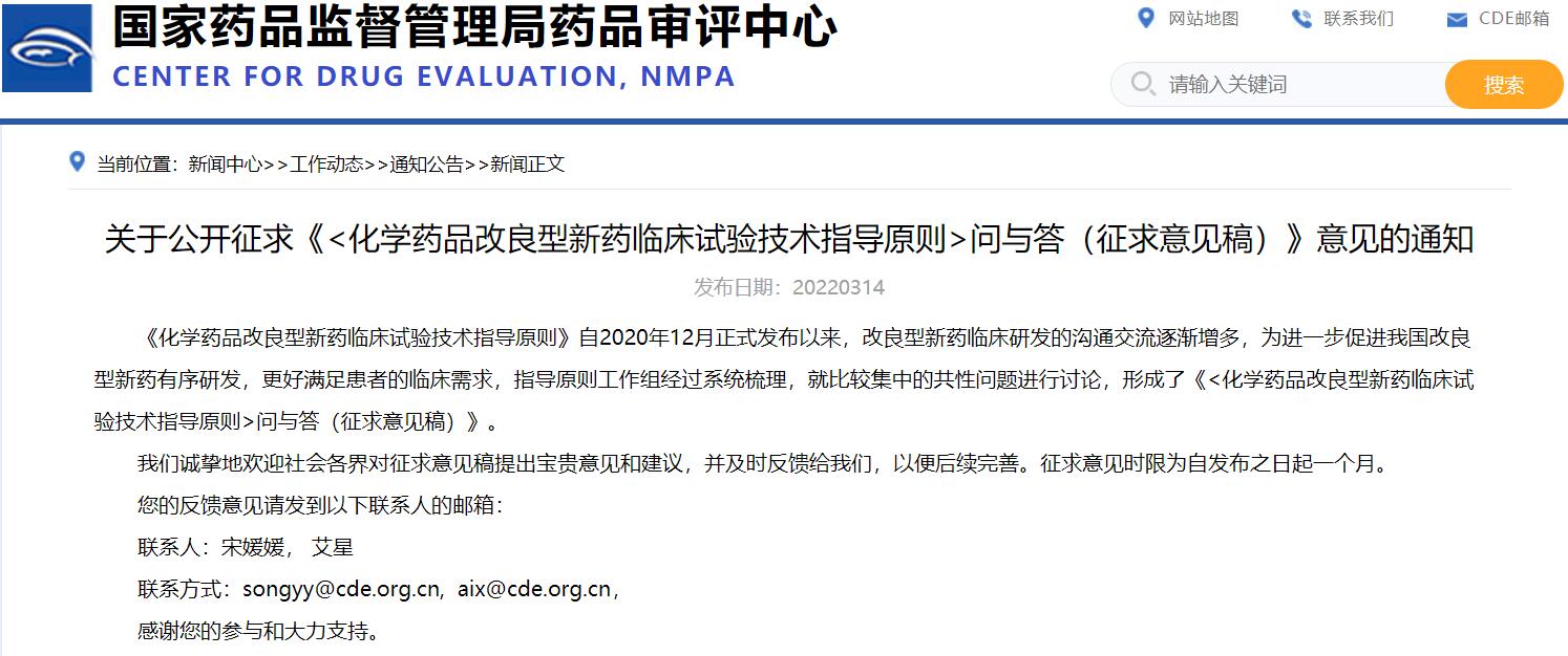關(guān)于公開征求《<化學藥品改良型新藥臨床試驗技術(shù)指導原則>問與答(征求意見稿)》意見的通知