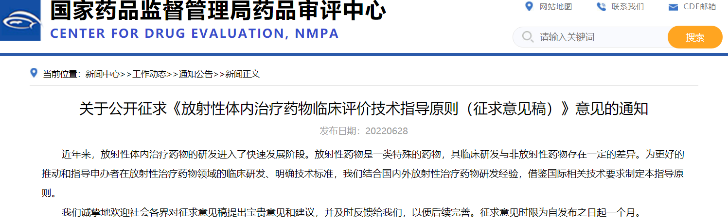 關于公開征求《放射性體內治療藥物臨床評價技術指導原則(征求意見稿)》意見的通知