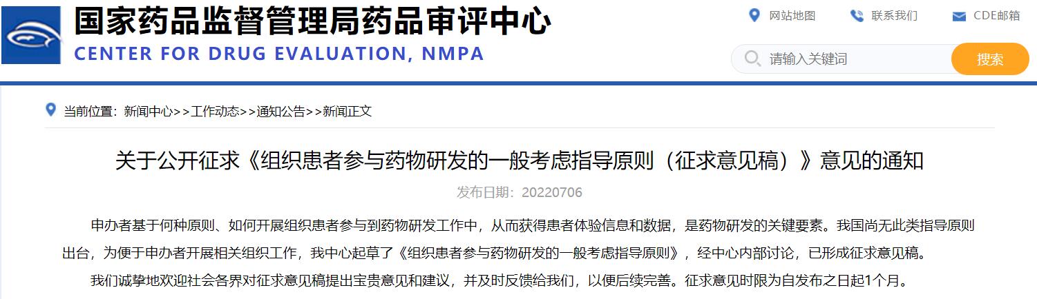 關于公開征求《組織患者參與藥物研發的一般考慮指導原則(征求意見稿)》意見的通知