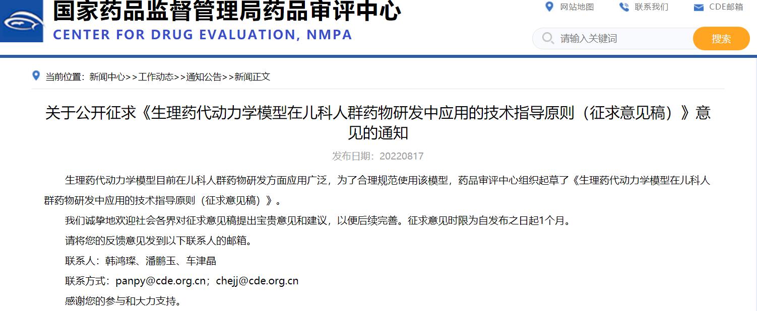 關(guān)于公開(kāi)征求《生理藥代動(dòng)力學(xué)模型在兒科人群藥物研發(fā)中應(yīng)用的技術(shù)指導(dǎo)原則(征求意見(jiàn)稿)》意見(jiàn)的通知