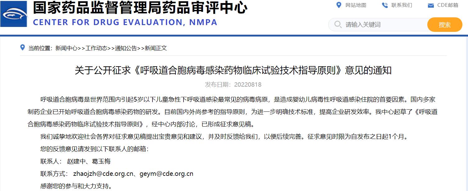 關(guān)于公開(kāi)征求《呼吸道合胞病毒感染藥物臨床試驗(yàn)技術(shù)指導(dǎo)原則》意見(jiàn)的通知