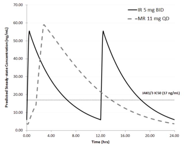 ·多劑量研究中(連續服用5天),托法替布緩釋片11mg(qd)與托法替布片5mg(bid),開展BE試驗。