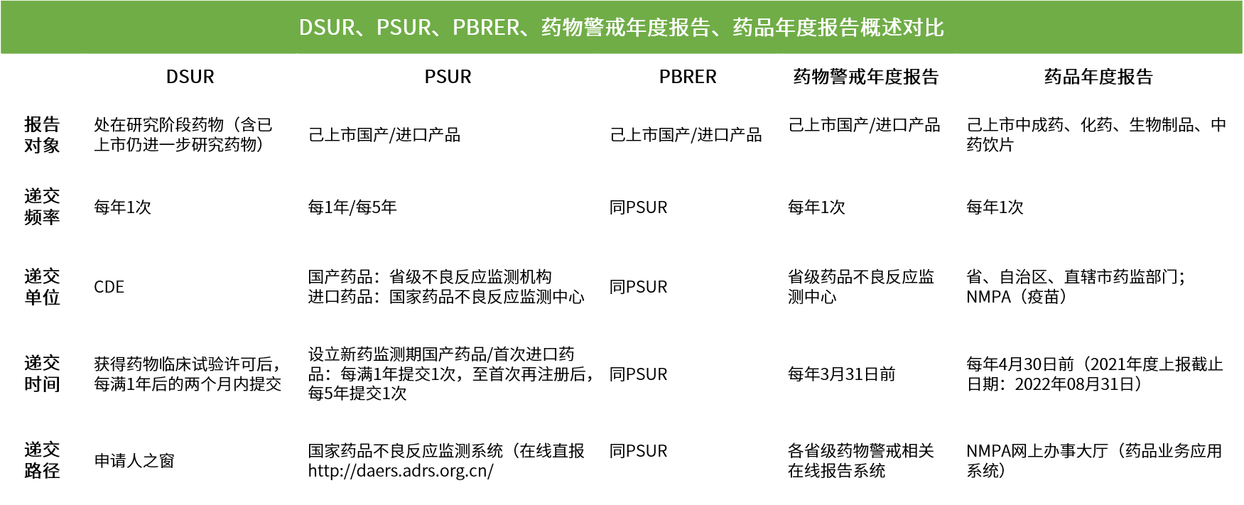 藥品上市后報告主要分為四類,定期安全性更新報告(PSUR)、定期獲益-風險評估報告(PBRER)、藥物警戒年度報告和藥品年度報告。
