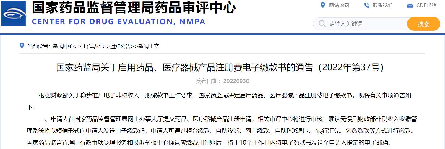 國家藥監局關于啟用藥品、醫療器械產品注冊費電子繳款書的通告(2022年第37號)